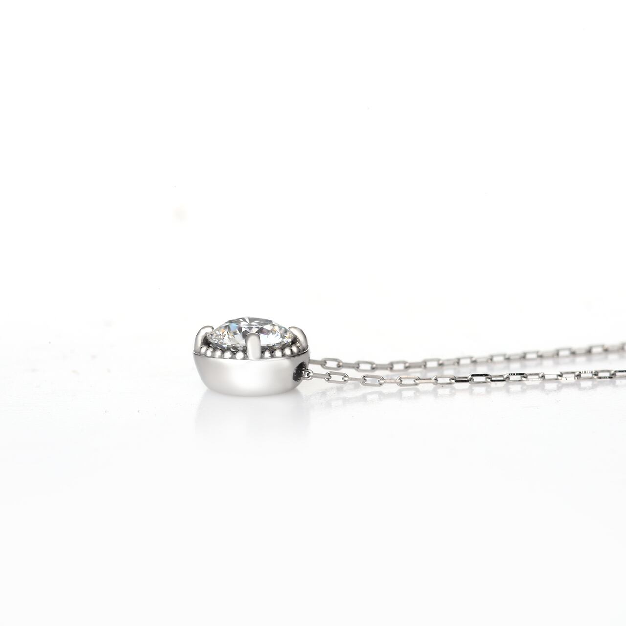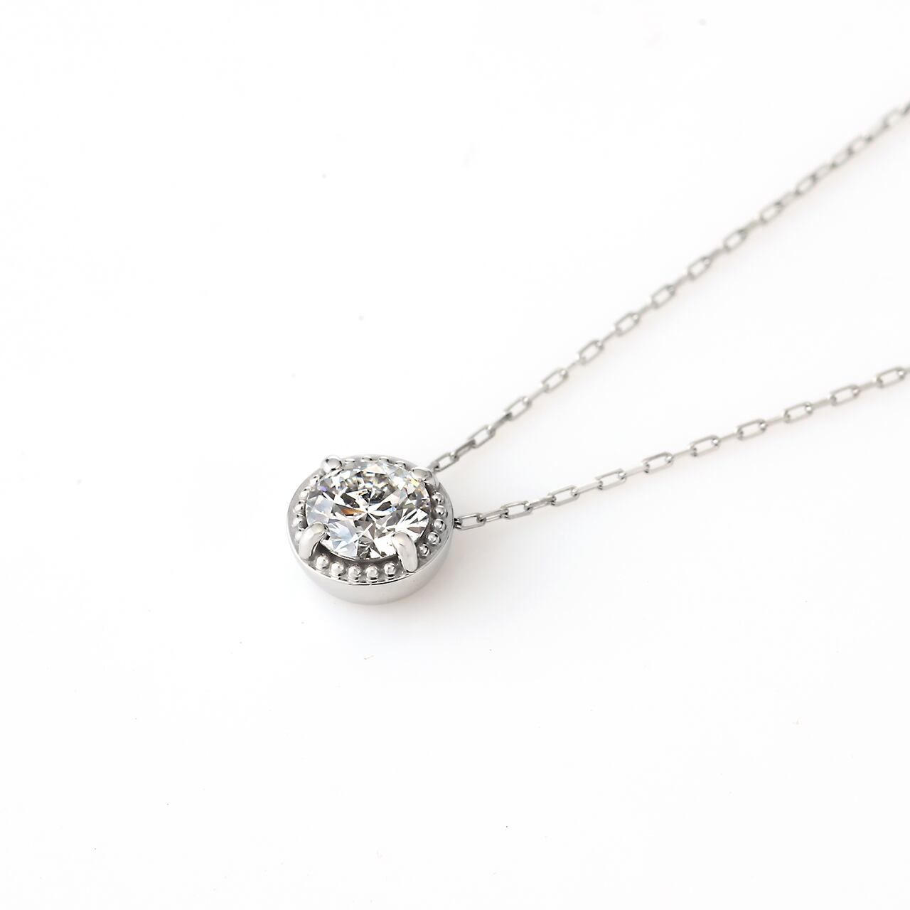 ジェントリーミルセッティングは、繊細で独自のデザインが際立つペンダントです。熟練の職人技によって、ダイヤモンドは優しく、そして力強く包み込まれ、まるで光そのものを身に着けているかのような錯覚を覚えます。特に、扱いが難しいTimelessPlatinumを自在に操る職人の技術と、その硬質な地金が持つ力強さが、柔らかな雰囲気を醸し出すミルグレインと融合した様は、まさに圧巻です。